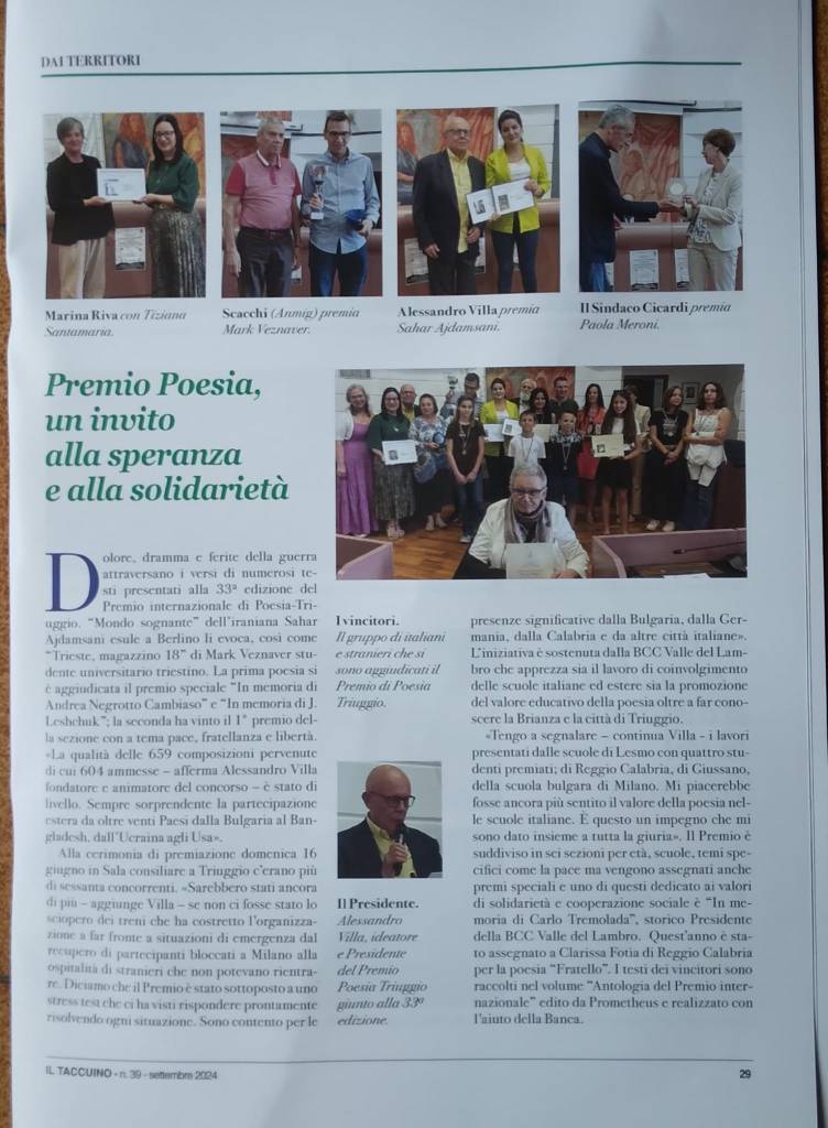 Ecco l’articolo uscito sul periodico della Banca BCC, per celebrare la 33° edizione del Premio Internazionale di Poesia.