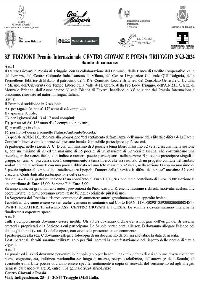 Senza categoria 33° EDIZIONE Premio Internazionale CENTRO GIOVANI E POESIA TRIUGGIO 2023 – 2024 Date: 6 agosto 2025Author: villagiovaniepoesia 0 Commenti Condividi: Fai clic per condividere su X (Si apre in una nuova finestra) X Fai clic per condividere su Facebook (Si apre in una nuova finestra) Facebook Mi piace Caricamento... Correlati